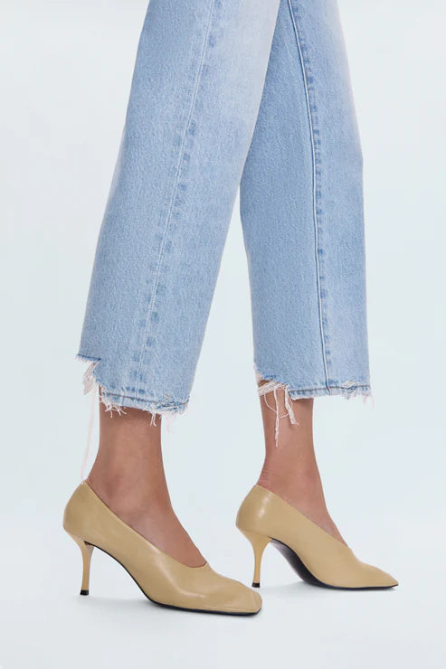 Super high rise waist with a composed straight leg silhouette, button-fly closure and cropped ankle hem. Crafted from rigid non-stretch denim for an expert fit that holds its shape. Offered in a timeless light wash with vintage inspired color fading, a subtle frayed hem, and hints of distressing.