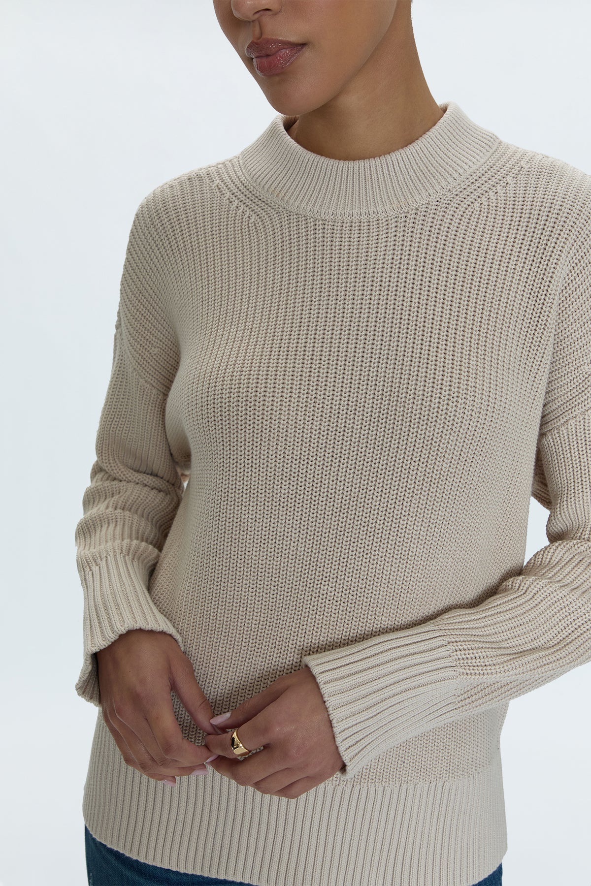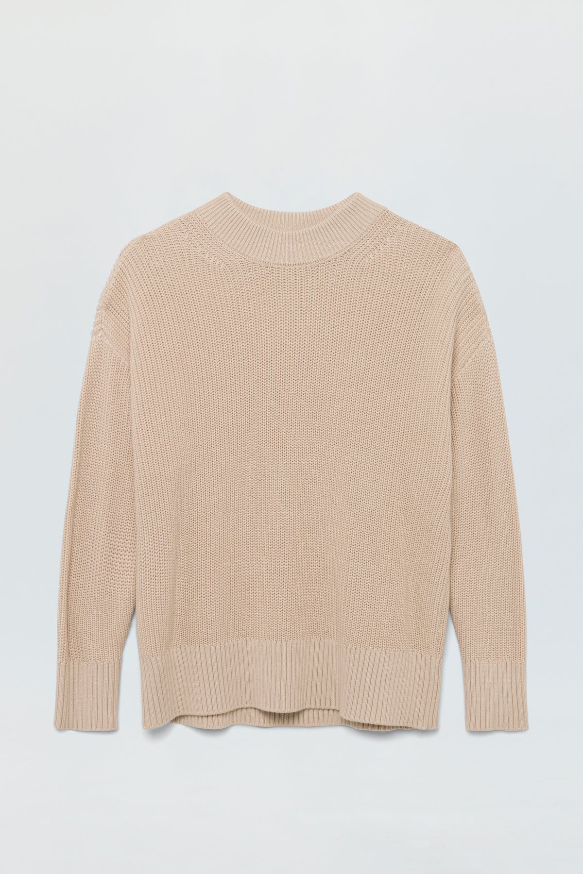 Mock neck long sleeve sweater with wide ribbed cuffs and collar. Crafted from a marled, waffle knit with directional knitting and dropped shoulders for a relaxed fit and transitional wearability. Dove is a neutral hue with cool undertones.