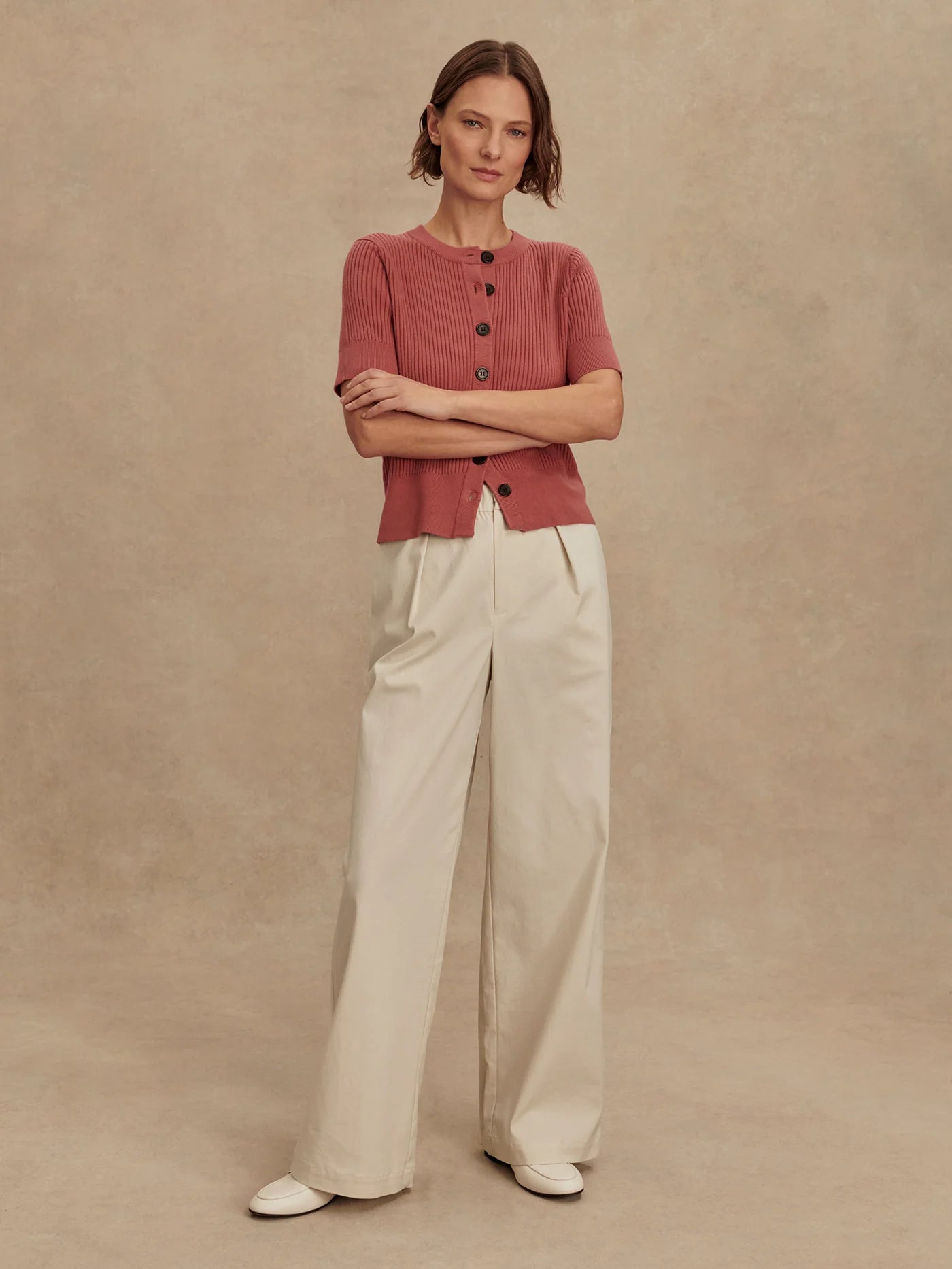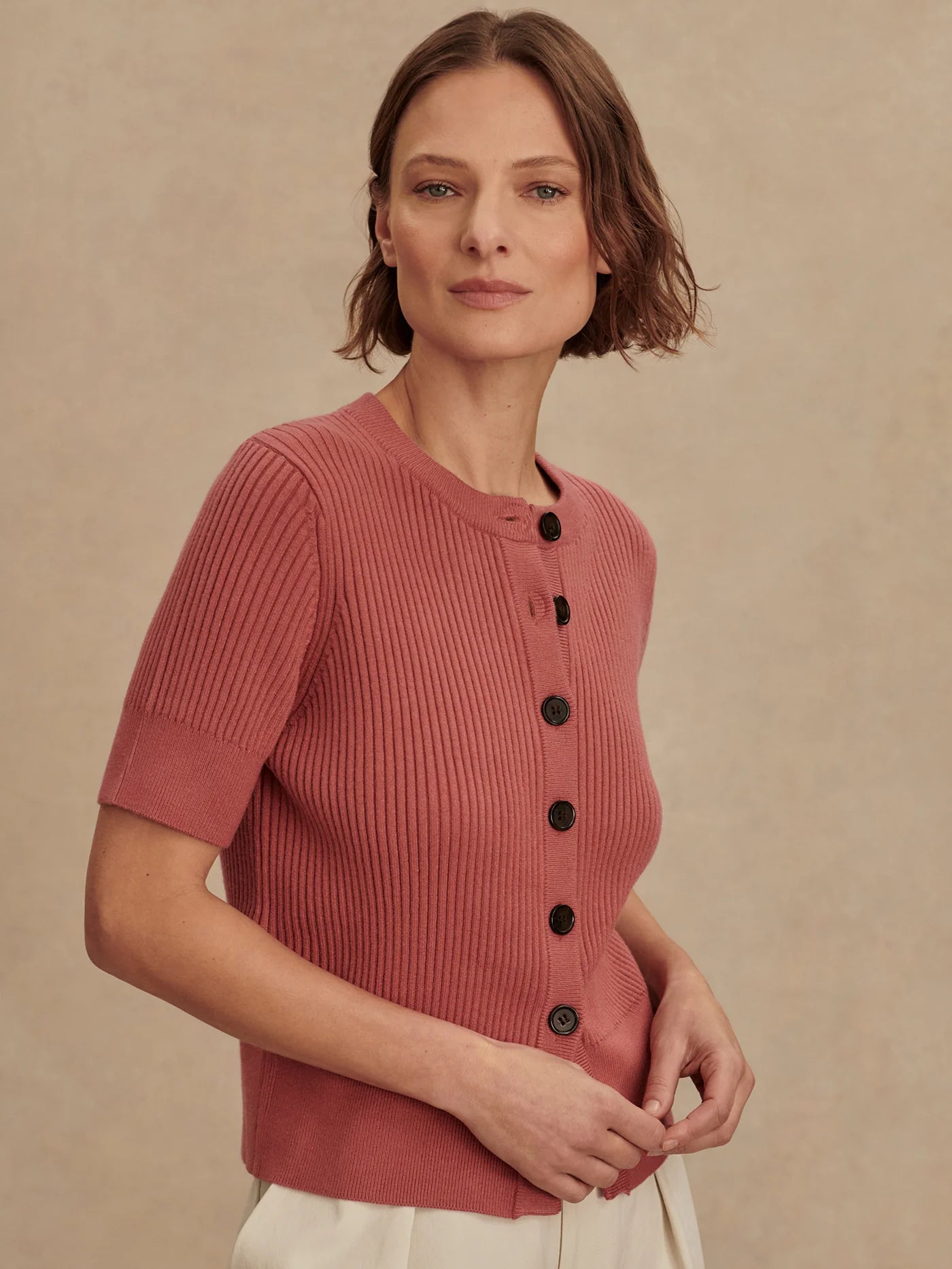 The Micha is a contemporary cardigan with short sleeves, blending versatile wearability with an elegant design. Crafted from a Soft Viscose yarn in a fine-gauge, all-over rib stitch, it is soft to the touch. Made in a classic cardigan T-shape with a button-through front, crew neck, and set-in sleeves.