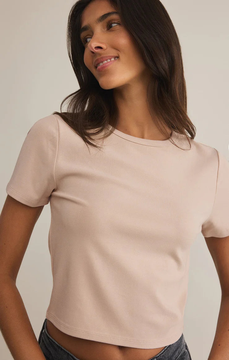 This short-sleeve crewneck top is made with Second Skin Baby Rib fabric, giving it a soft, slightly stretchy feel. Designed to be tucked or worn loose, it’s a staple for layering or wearing alone depending on the occasion.